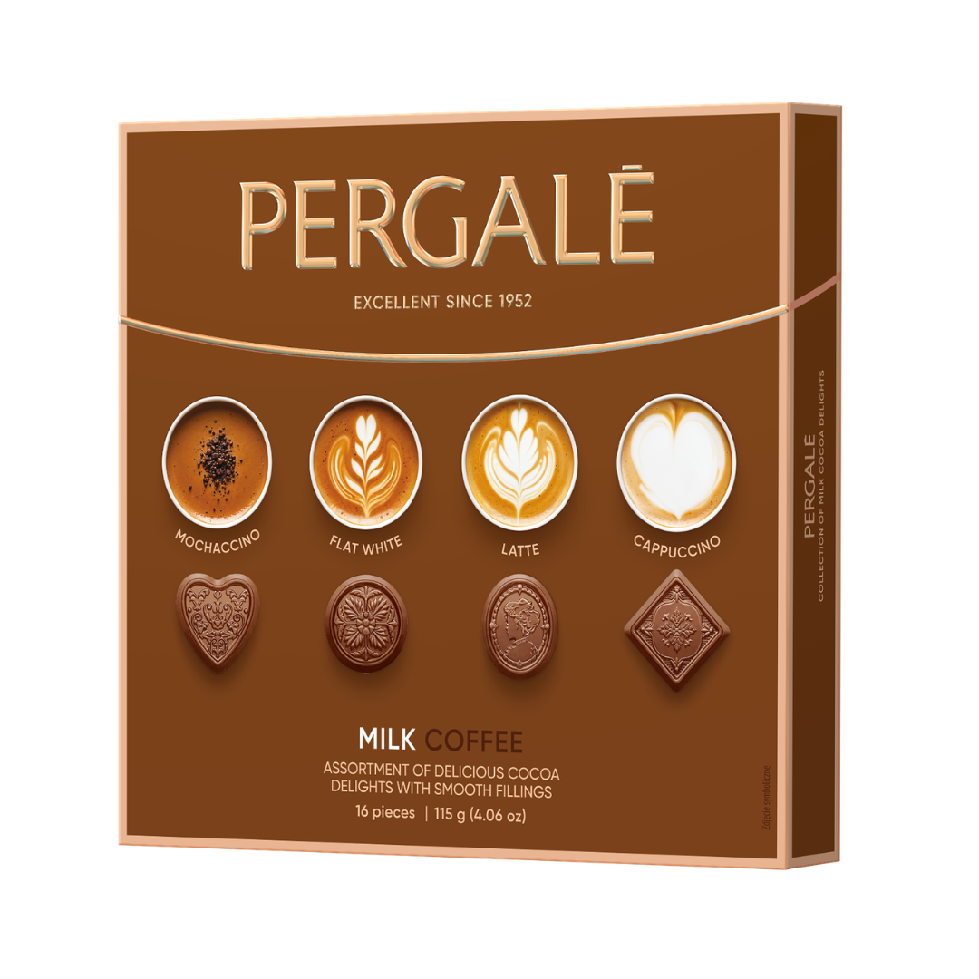 Pergalé POP-COFFEE válogatás 115g – Tejcsokoládés praliné mokka, flat white kávé, mogyorós latte és cappuccino ízű töltelékkel